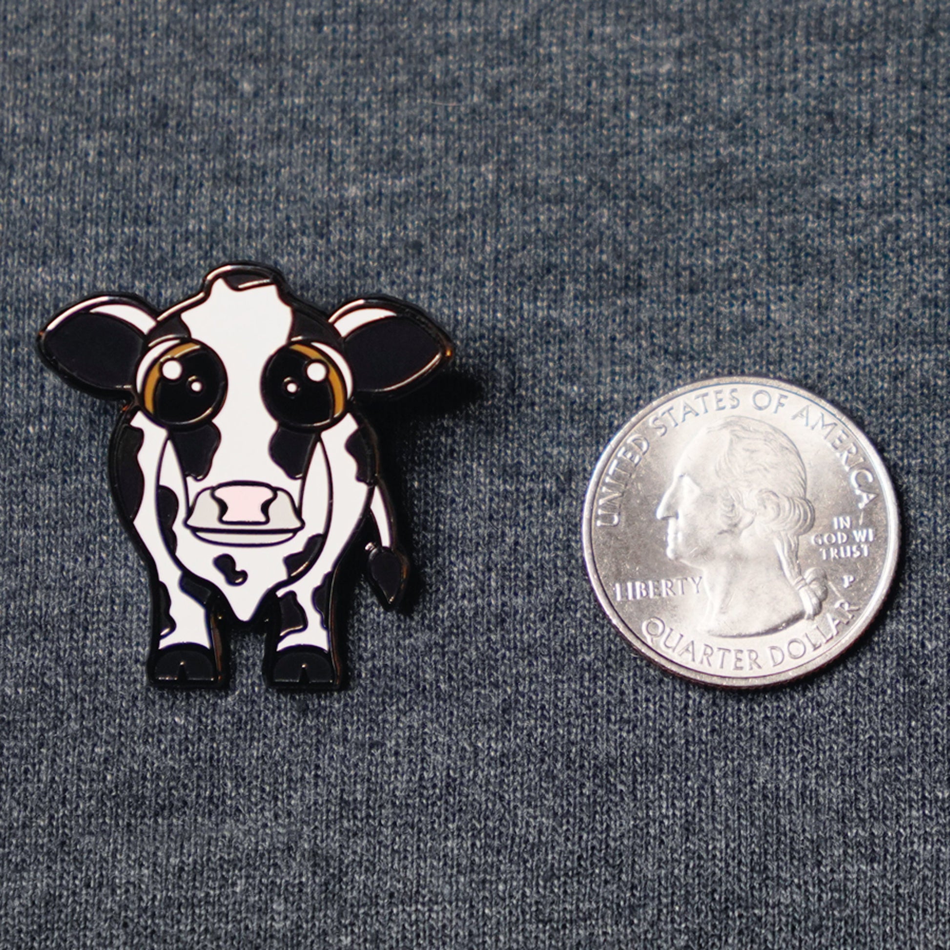 Cowaline the Cow is a 1.25" hard enamel cow pin with black nickel plating, a rubber clutch, and our logo stamped on the back. Also Included on the backing card is Cowaline's story and collector number (#33)